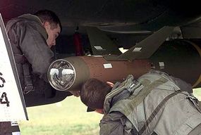 - Attached to the front of the barrel is a laser-guidance assembly. Either a spotter on the ground or in the bomber illuminates the target with a laser, and the bomb homes in on the illuminated spot. The guidance assembly steers the bomb with fins that are part of the assembly.