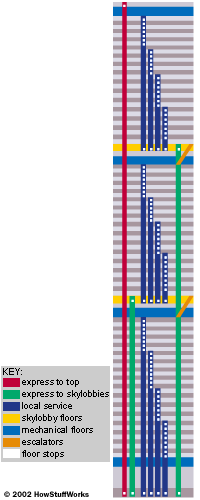 The WTC crew proposed a completely different system for the huge towers. Instead of building enough elevators to move everybody from the ground floor to their destination, they decided to split the trip to the upper floors between multiple elevators. If people wanted to get from the ground to the top floor, they would need to jump from elevator to elevator, in the same way you might switch cars on a subway system.