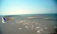 Changes in Assateague Island as a result of accelerated erosion from the man-made rock jetties of Ocean City Inlet (top: photo of the inlet, bottom: map of the area with outline showing the position of the island in 1849).