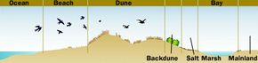 The structure of a typical barrier island consists of the following zones, from the ocean side toward the sound side: